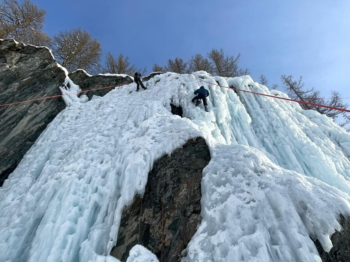 Après-midi — Session cascade de glace (2-3h) : Déplacement sur le site avec votre guide. Équipement complet fourni : baudrier, piolets, crampons et casques . Le guide vous explique les techniques de progression sur glace, l’utilisation des piolets, le cramponnage, l’assurage. Puis c’est à vous ! Chacun grimpe à tour de rôle sur cette paroi glacée verticale, assuré par un collègue. Une activité spectaculaire qui demande concentration, technique et engagement physique.